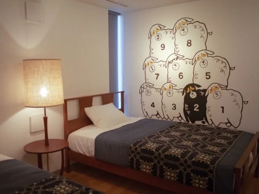 Room 4BC connects two distinct artistic spaces, “ALGORITHM” (by OG SLICK & MHAK) and “BAA BAA BLACK SHEEP” (by COOK), creating a luxurious 51.14m² suite. This Western-style connecting room features a unique collaboration of artists and offers ample space with two double beds and two futon sets. Ideal for groups, it comes fully equipped with kitchens and laundry facilities, allowing guests to enjoy a comfortable and immersive art experience during their stay.