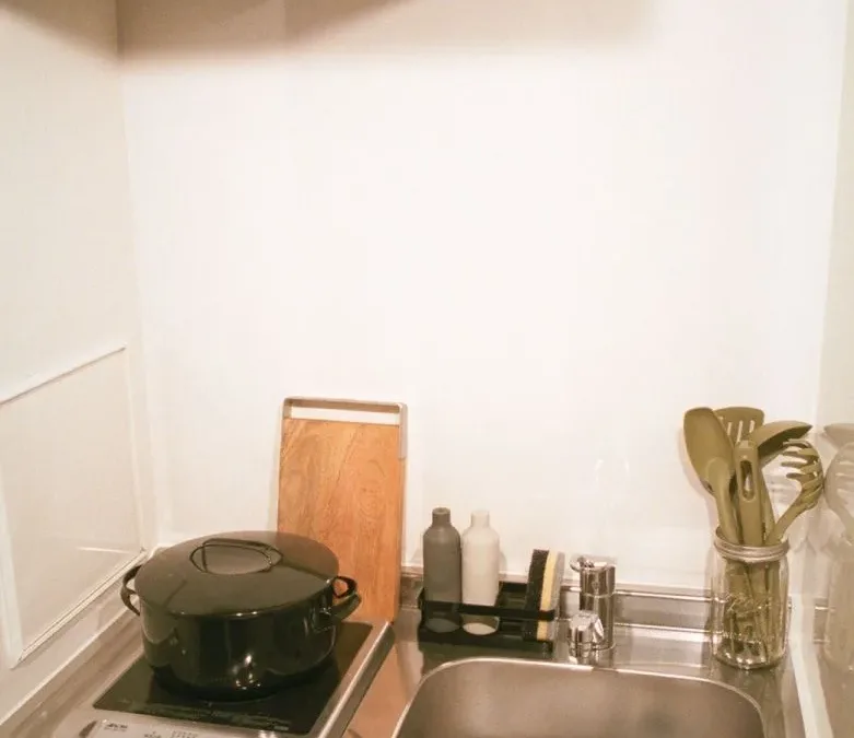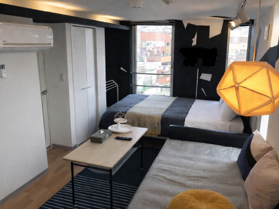 Located on the top floor, Room 5D “Pilot Room” features an exclusive collaboration mural by legendary street artists COOK and OG SLICK. This 25.46m² Western-style room offers a sophisticated modern atmosphere, curated by interior stylist Shinya Endo. Furnished with a double bed, a single bed, and a futon set, it comfortably accommodates couples or families. With full amenities including a kitchen and laundry facilities, guests can enjoy a unique and convenient stay surrounded by authentic art.