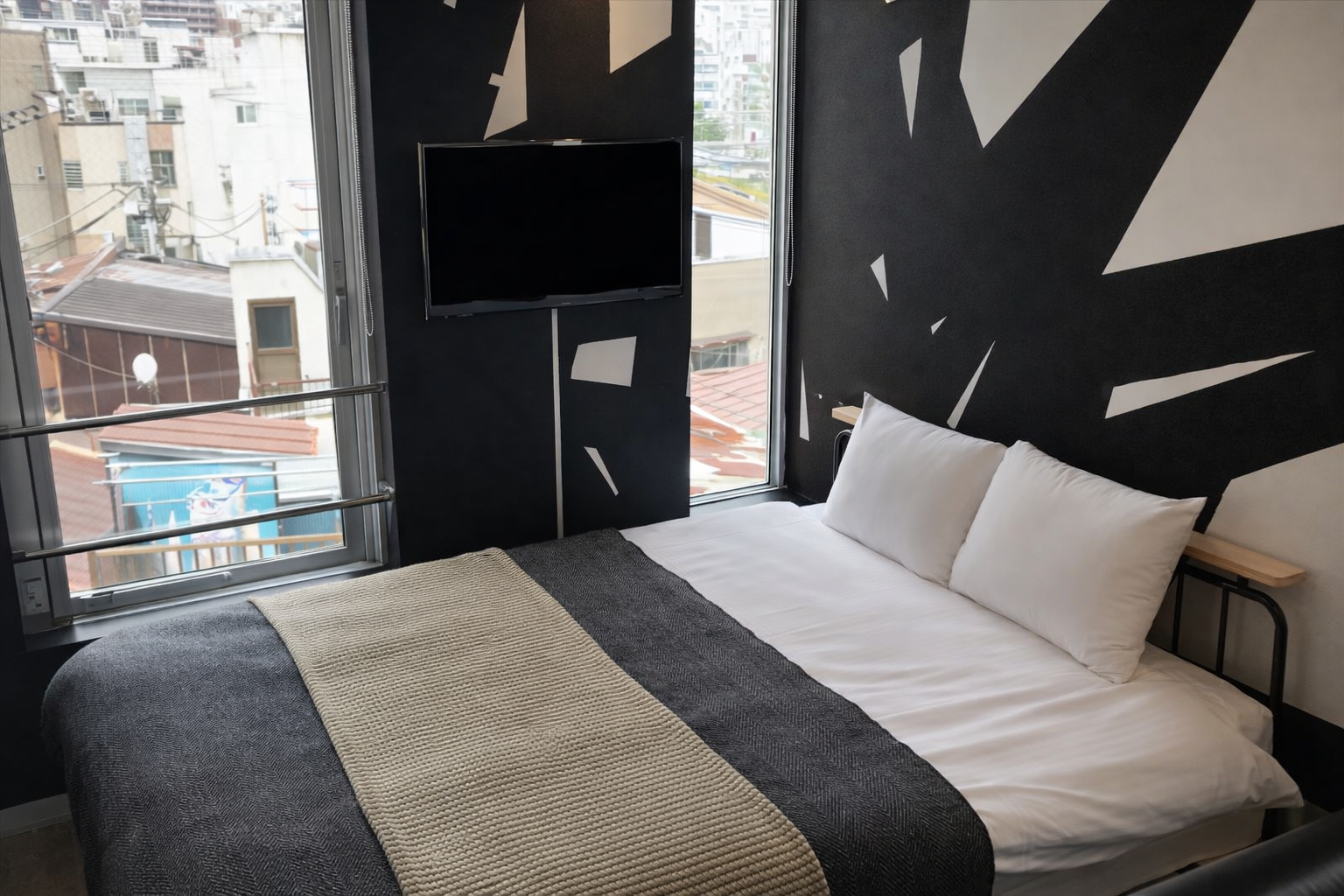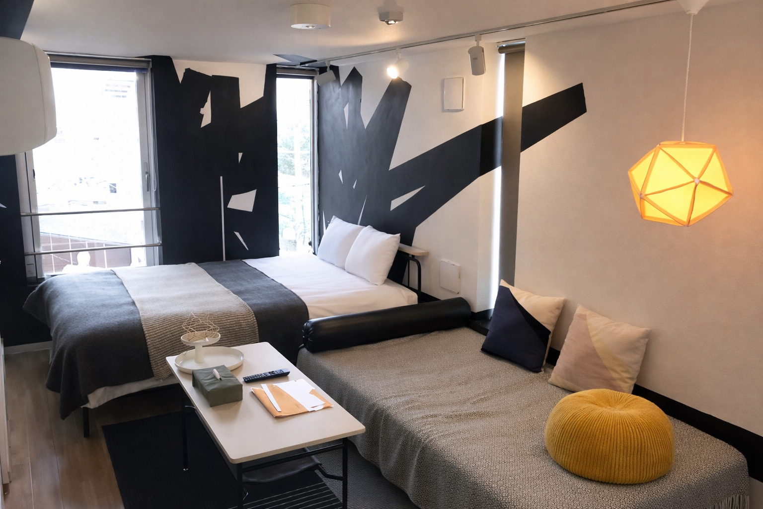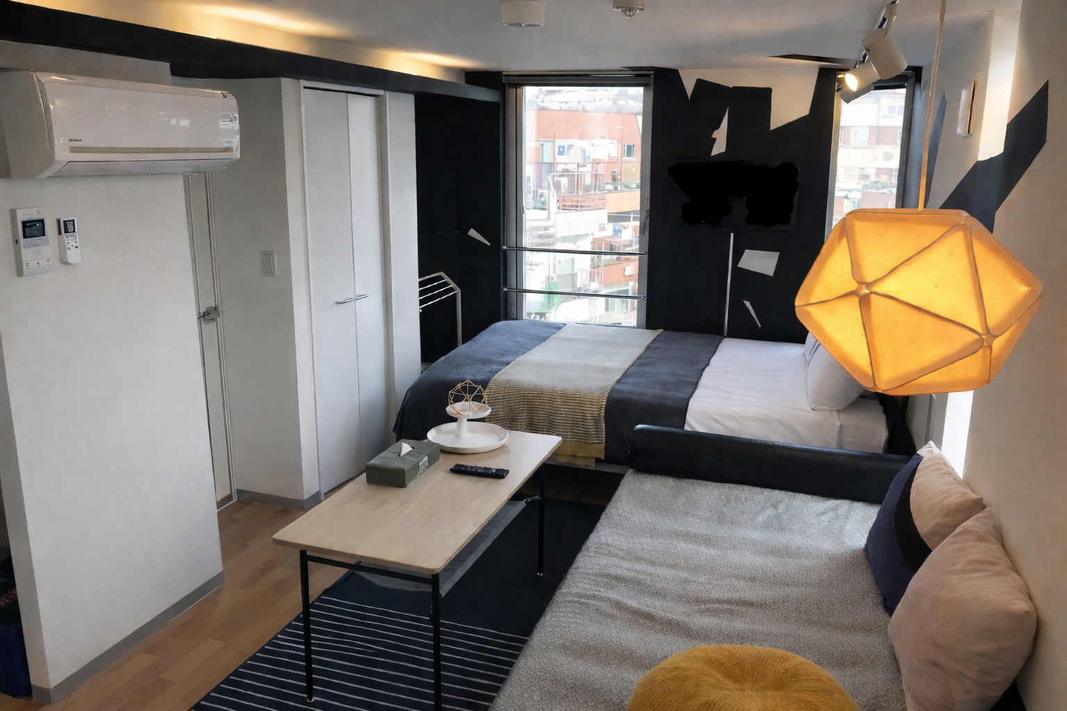 Located on the top floor, Room 5D “Pilot Room” features an exclusive collaboration mural by legendary street artists COOK and OG SLICK. This 25.46m² Western-style room offers a sophisticated modern atmosphere, curated by interior stylist Shinya Endo. Furnished with a double bed, a single bed, and a futon set, it comfortably accommodates couples or families. With full amenities including a kitchen and laundry facilities, guests can enjoy a unique and convenient stay surrounded by authentic art.