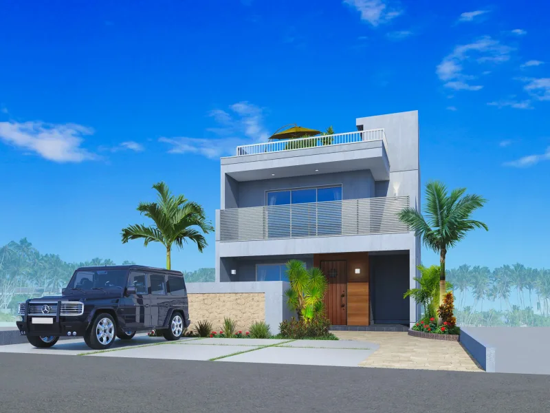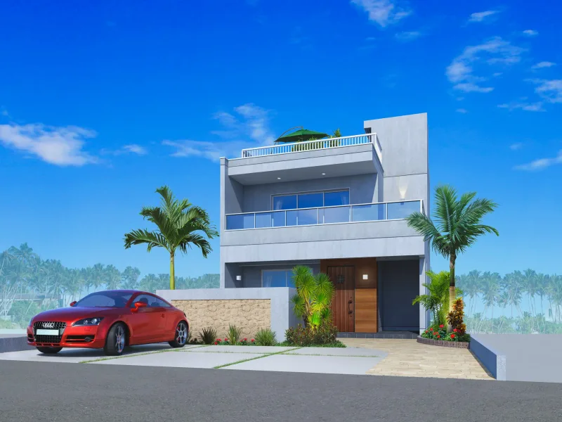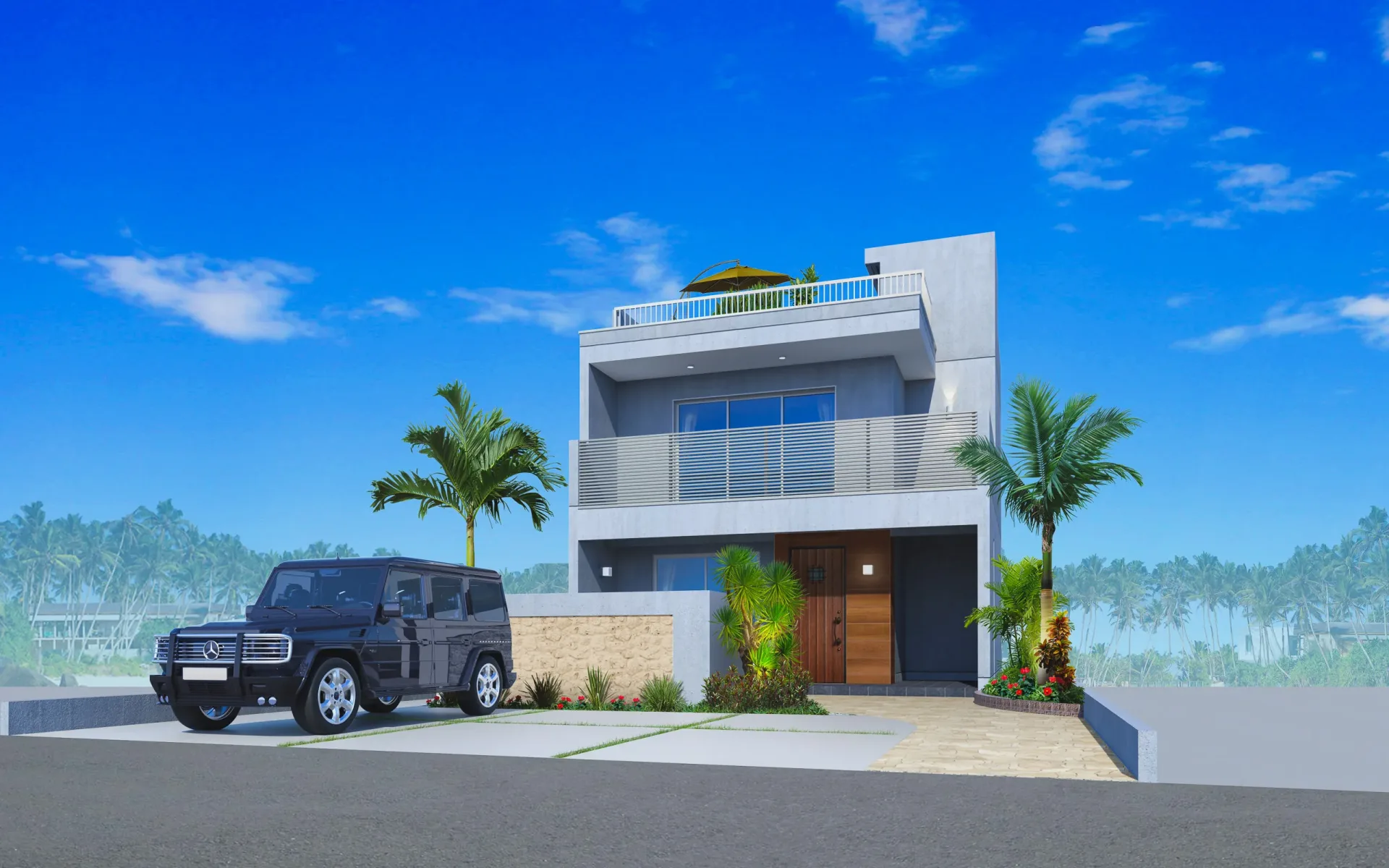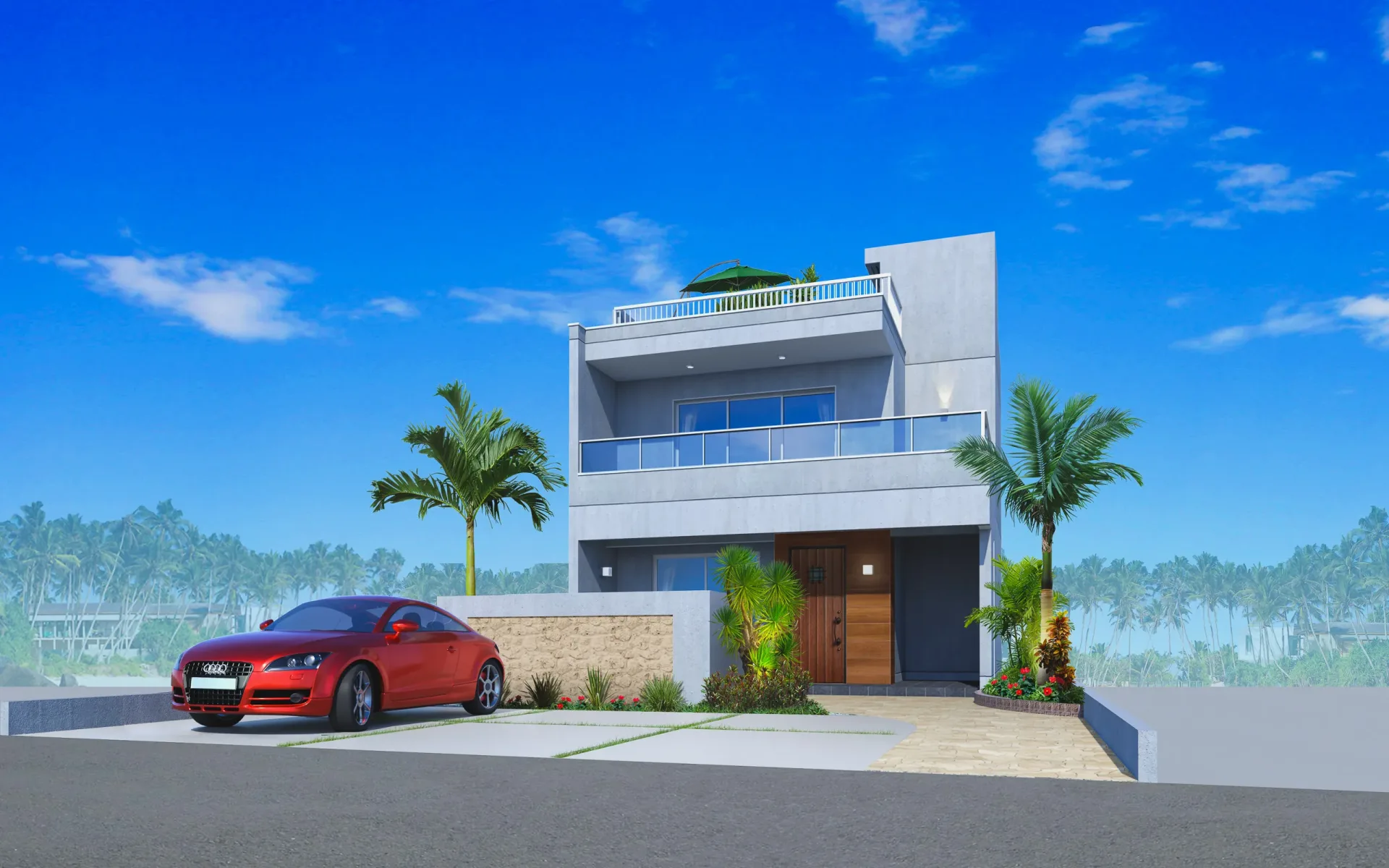 ※完成予想図は設計段階の図面を基に描き起こしたもので、形状・色等は実際とは異なる場合があります。形状の細部、設備機器等は表現していません。表現されている植栽は設計段階のものであり、変更になる場合があります。また葉の色合いや枝ぶりや樹形は想定であり、竣工から生育期間を経た状態のものを描いています。敷地周辺の建物などについては省略しています。車両は価格に含まれません。