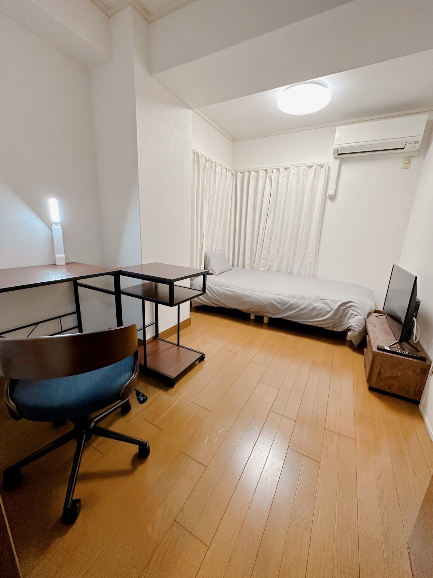 イス、カーテン付き、シーツ類、テーブル、テレビ台、デスク、ベッド、寝具一式